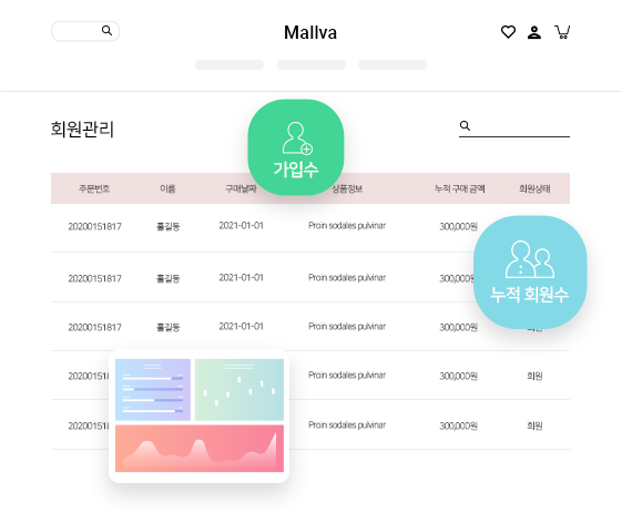 - 회원가입 수와 누적 회원 가입수를 한눈에 확인할 수 있습니다. 나의 쇼핑몰 회원들의 정보 또한 한눈에 확인하세요!
